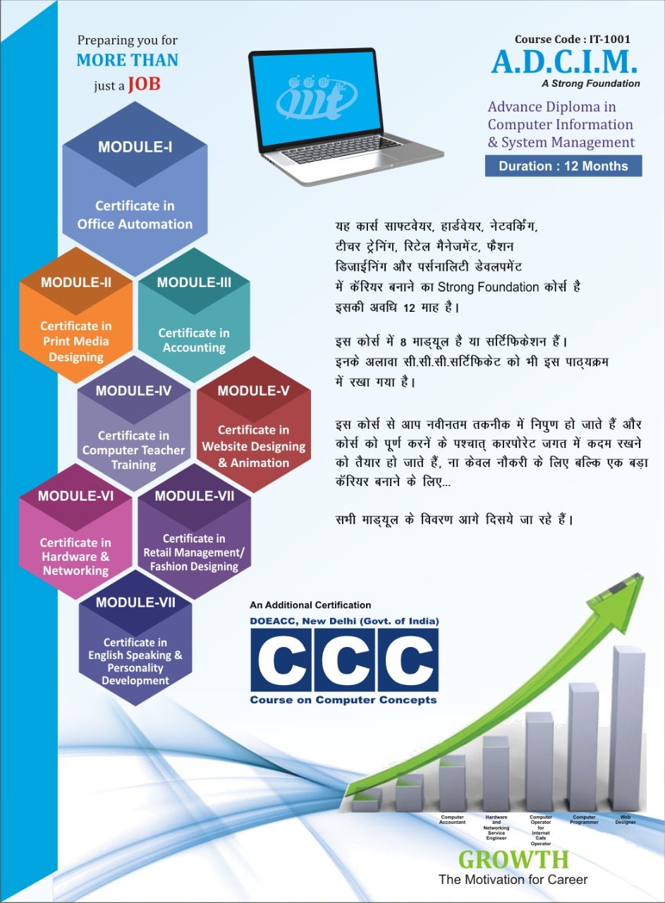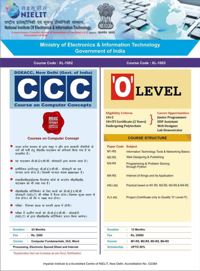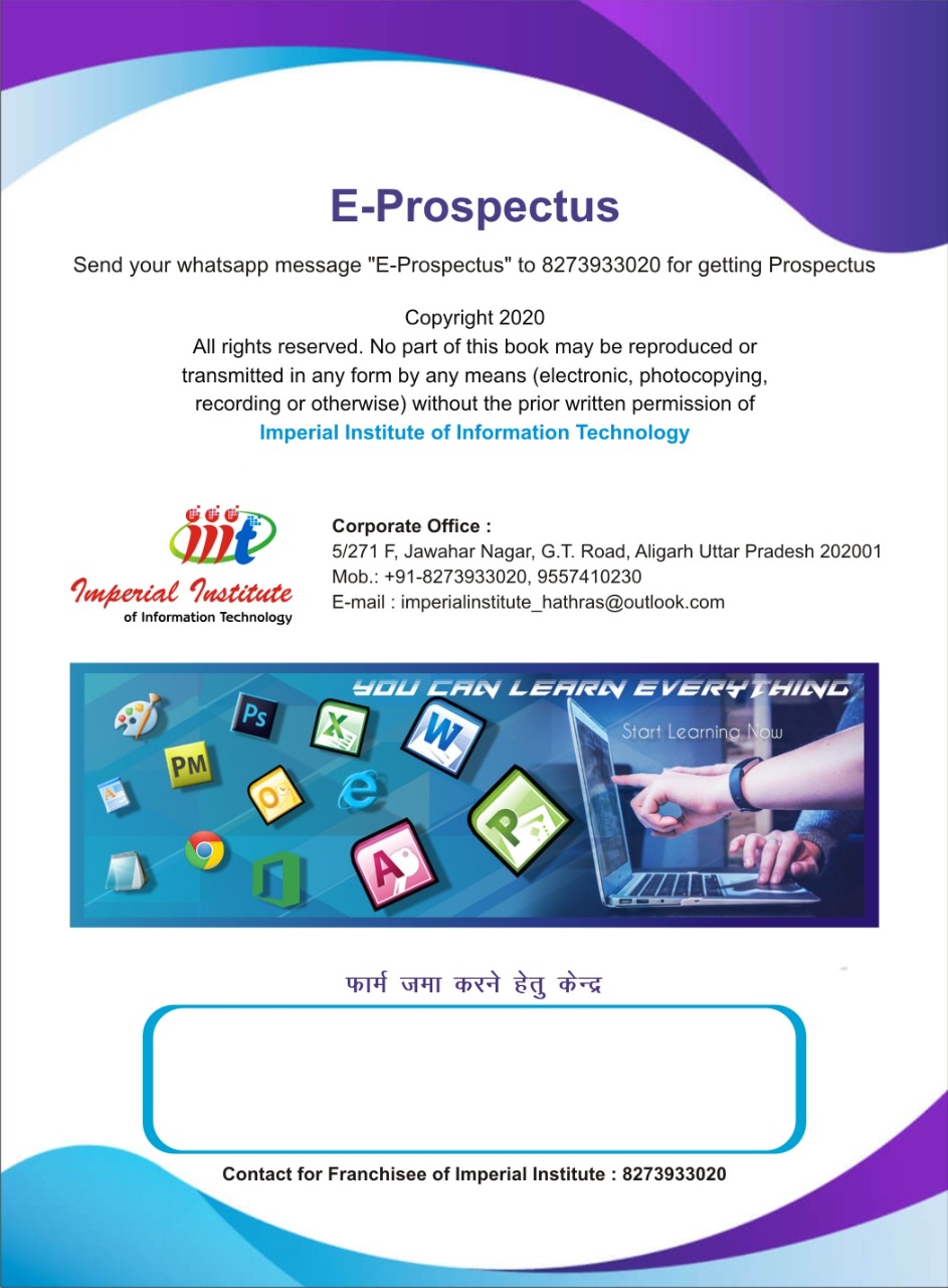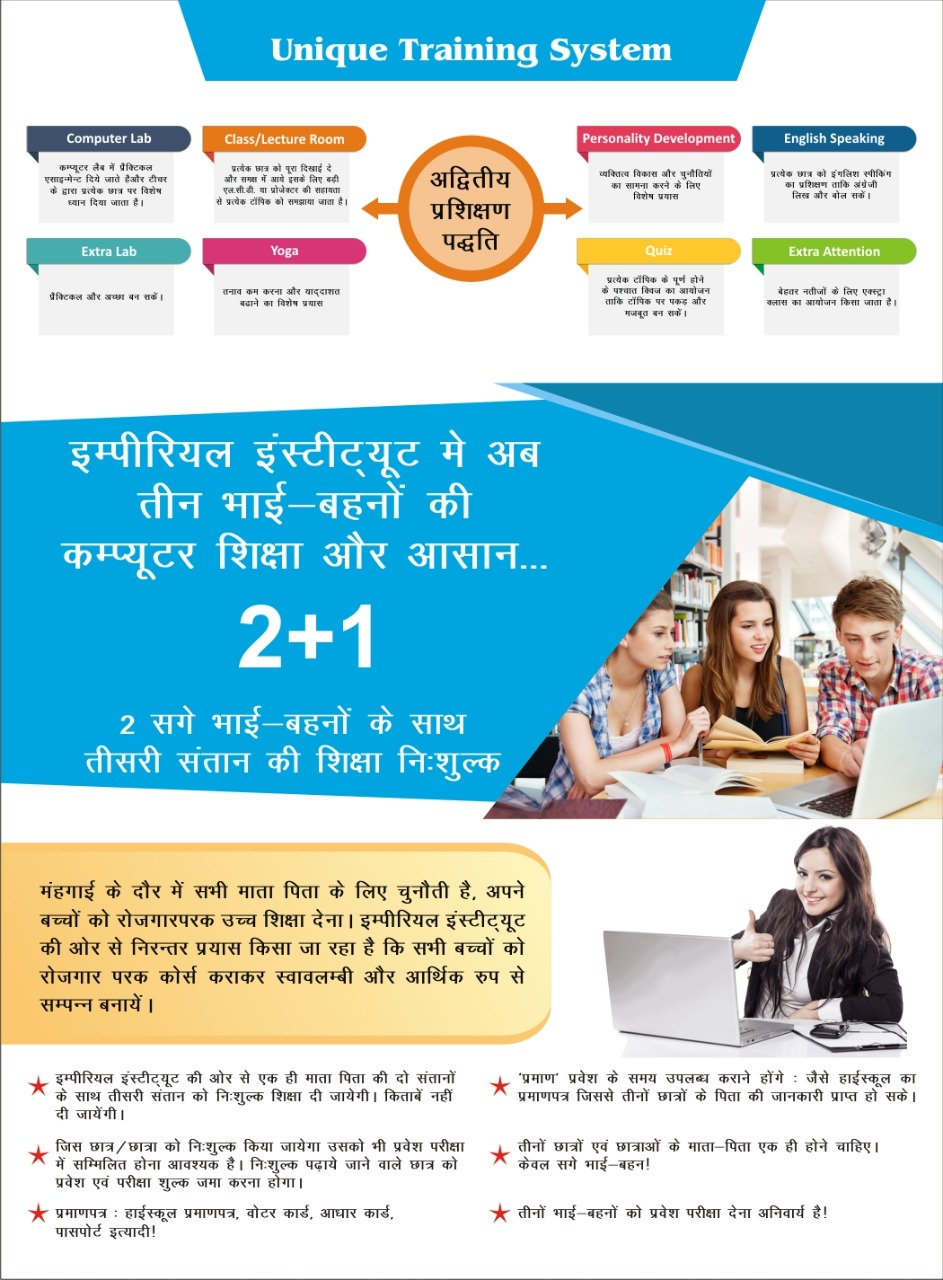 जब आप इम्पीरियल कम्पूटर्स के कोर्स को चुनते है, तो यह निश्चित हो जाता है, कि आप को जॉब या नौकरी की आवश्यकताओं से ज्यादा तैयार किया जा रहा है। व्यक्तित्व विकास, योगा, कम्यूनिकेशन स्किल से और हमारी विलक्षण सिखाने की पद्धति से आपको विशेष गुण मिलते हैं, तो आपका पूर्णता विकास करता है और आत्मविश्वास पैदा करता है। जब आप कोर्स पूरा करने के पश्चात बाहर जाते हैं, तब आप जीवन की चुनौतियों का सामना करने के लिए अस्त्र शस्त्रों के साथा तैयार हो चुके होते हैं।