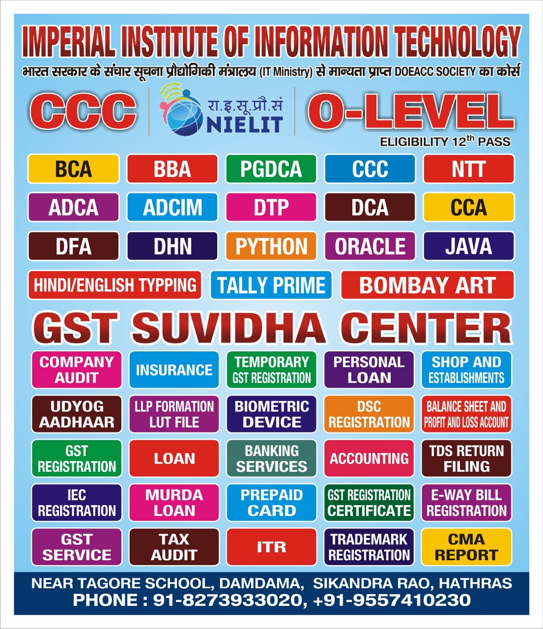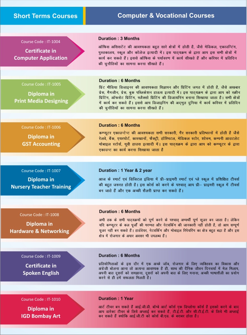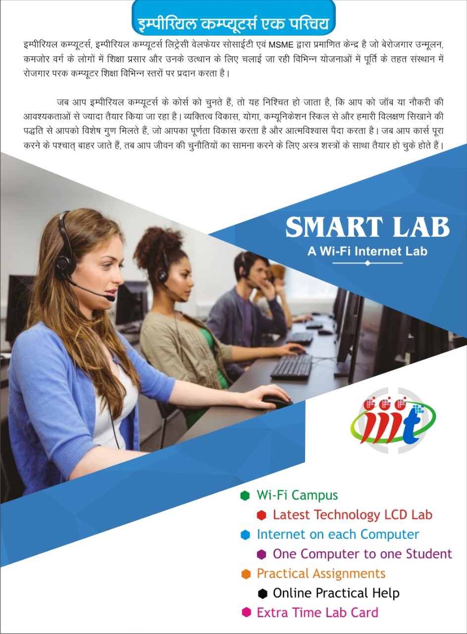 इम्पीरियल कम्प्यूटर्स, इम्पीरियल कम्प्यूटर्स लिट्रिसी वेलफेयर सोसाईटी एवं MSMS द्वारा प्रमाणित केन्द्र है जो बेरोजगार उन्मूलन, कमजोर वर्ग के लोगों में शिक्षा प्रसार और उनके उत्थान के लिए चलाई जा रही विभिन्न योजनाओं में पूर्ति के तहत संस्थान में रोजगार परक कम्प्यूटर शिक्षा विभिन्न स्तरों पर प्रदान करता है।